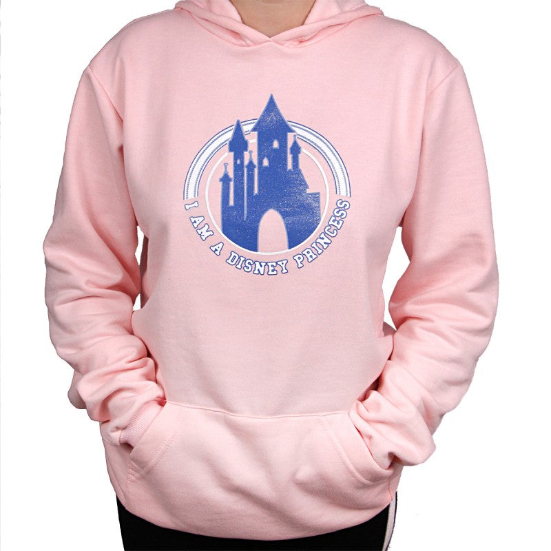 Blusão feminino de manga longa confeccionado em moletom com forro flanelado, capuz e bolso canguru para você ficar bem quentinha! Traz uma linda estampa frontal do castelo da Cinderela com a frase "I am a Disney Princess". Um rosa incrível que combina muito bem com calça legging, jeans ou sarja. Acabamento e costura no tom. Pronta para entrar na moda Disney?