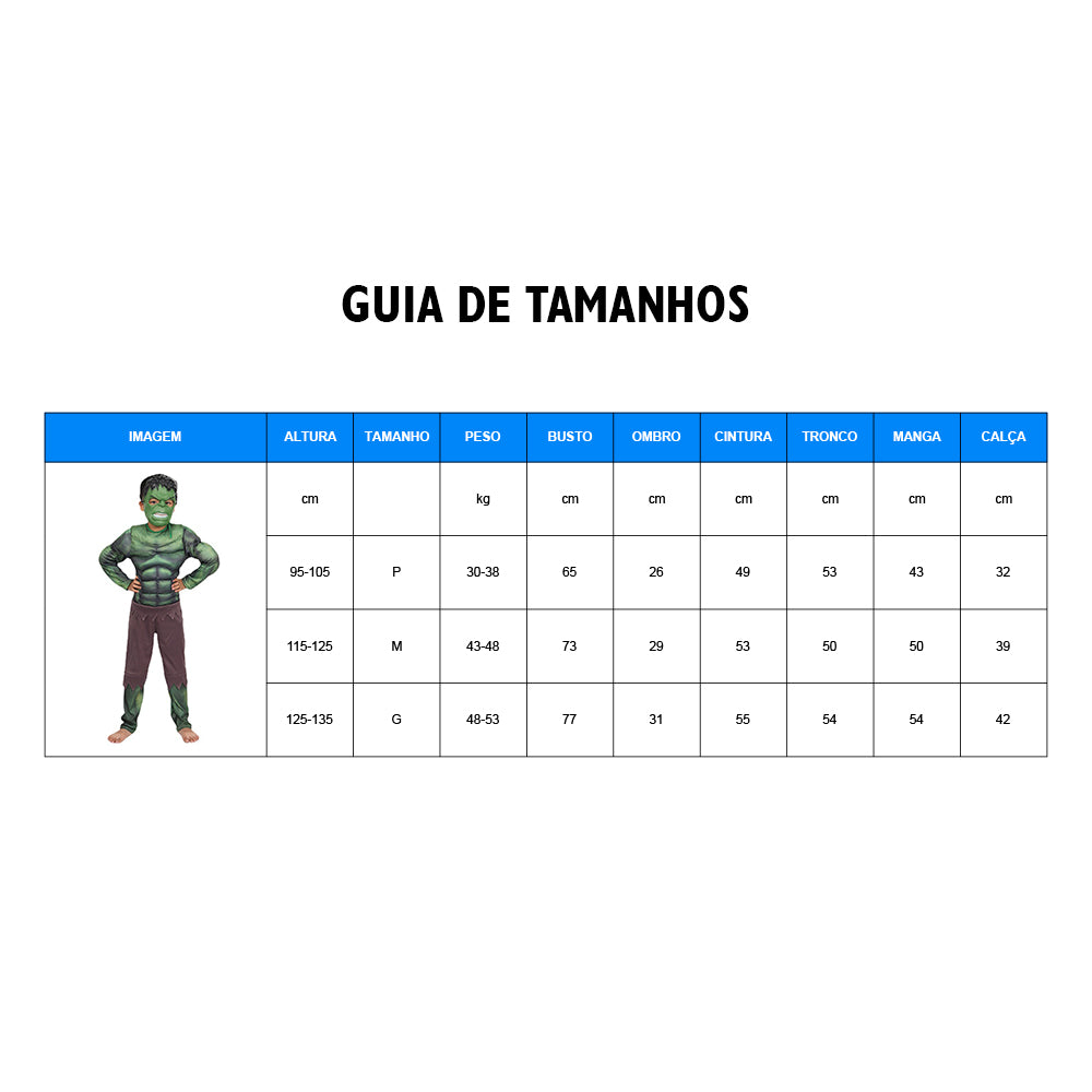 Os tamanhos informados na etiqueta podem variar de acordo com o personagem, por esta razão recomendamos que selecione o tamanho baseado na ALTURA da CRIANÇA. O tamanho na etiqueta corresponde à numeração americana e não necessariamente à idade. Maiores informações, consulte a imagem GUIA DE TAMANHOS.